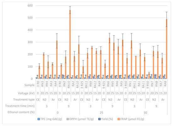 Determination of bioactive compounds—total phenolic compounds (TPC) values, antioxidant activity (2-diphenyl-2-picrylhydrazyl (DPPH) and ferric reducing ability of plasma (FRAP) and yield of extraction—measurements for CE and HVED treated samples. TPC = total phenolic content, DPPH = 2,2-diphenyl-2-picrylhydrazyl free radical assay, FRAP = ferric reducing ability of plasma; Treatment type: CE—conventional extraction, N2—HVED treatment with nitrogen, Ar—HVED treatment with argon.