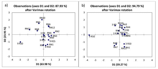 The principal component analysis (PCA) of rosemary extracts: (a) The data is denoting untreated rosemary samples, and rosemary samples treated with HVED using nitrogen; (b) The data is denoting untreated rosemary samples, and rosemary samples treated with HVED using argon.