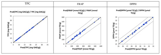 From those findings it was clear that the content of TPC and the antioxidative activity could be predicted. A part of the input spectral data was used for the model training (60%). After the training followed the PLSR model evaluation and its testing on unknown samples. Our aim was to predict those parameters not only qualitative but also quantitatively. In order to gain more accurate models, four different wavelength ranges were used (Model 1: λ = 904–1699 nm; Model 2: λ = 1349–1699 nm; Model 3: λ = 904–932 and 1349–1699 nm; and Model 4: λ = 904–932 nm). The first model (Table S1) which included the total range of NIR spectra resulted with the best model efficiency parameters (RPDs > 3 and RER > 10) what is an indication of very good quantitative model prediction []. The efficacy of model for prediction of TPC, DPPH, and FRAP using NIR is presented in Figure 5.
