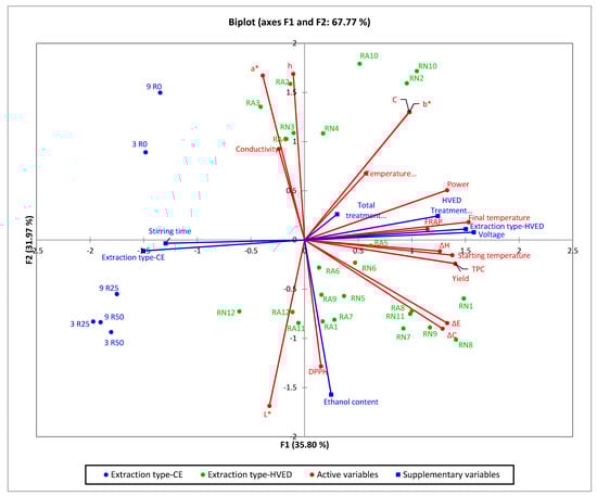 Data matrix used to identify similarities and/or differences in the data set presenting the samples as well as the physical and chemical properties. The PCAs ability to reduce the dimensionality and increasing the interpretability with minimal information lost was used on the data matrix of experimental data. The matrix included as active variables the physical parameters, total phenolic content and antioxidant capacity, as well as the parameters of color, while the supplementary data set were the experimental conditions (extraction type, HVED treatment time, stirring time, treatment time, voltage, and the ethanol content). The Extraction type (CE or HVED) were included in the analysis as qualitative variables (Figure 6). To present the differences in the samples which are extracted by CE or HVED, in the Supplementary Information are added boxplots for the TPC and AOX by use of DPPH and FRAP method and the yield, as well as the PCA biplot for different extractions and the physical-chemical properties Figures S3 and S4).