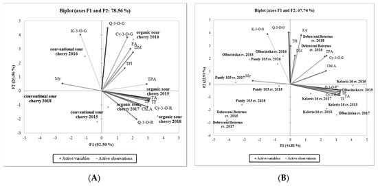Principal component analysis (PCA) analysis showing the relationship between the polyphenols composition and (A) cultivation systems as well examined (B) cultivars of sour cherry in 2015–2018. Dry matter (DM,) total polyphenols (TP), total phenolic acids (TPA), ferulic acid (FA), chlorogenic acid (ChLA), total flavonoids (TF), total flavonols (TFl), quercetin-3-O-rutinoside (Q-3-O-R), quercetin-3-O-glucoside (Q-3-O-G), kaempferol-3-O-glucoside (K-3-O-G), myrycetin (My), total anthocyanins (TA), cyanidin-3-O-rutinoside (Cy-3-O-R), cyanidin-3-O-glucoside (Cy-3-O-G).