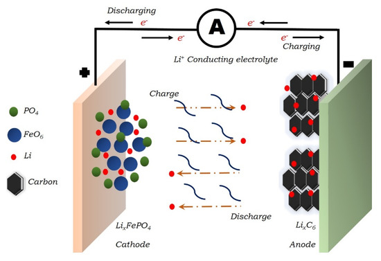 The continuous depletion of fossil fuels and their hazardous byproducts are leading us in the search for clean and sustainable sources of energy [1,2]. During the past few decades, researchers have put huge efforts into the search for renewable sources of energy like solar energy, wind energy, tidal energy, etc. However, their time- and location-dependent availability again forced us to think in the search for energy storage technologies, which can balance the demand and supply efficiently. In addition to this, the reduction in CO2 emission is one of the biggest hurdles to overcome the global warming issue. Electrochemical batteries [3,4], fuel cells [5,6,7], solar cells [8,9], etc. are helping to reduce the carbon emission [10,11,12]. The most suitable and advantageous solution to fulfill these requirements is electrochemical batteries. Batteries are the most attractive way to store energy in a chemical form and convert it to electrical energy [13,14,15,16], when needed. The assembly for the battery consists of negative and positive electrodes, whereas electrolytes are used as a separator in the electrochemical batteries. A wide range of classification of batteries is available, including lithium-ion batteries, nickel-cadmium batteries, lead-acid batteries, nickel-metal hybrid batteries, etc. From this available class of batteries, Li-ion batteries are widely used due to their high specific energy density and high cyclic stability in comparison to rest. The schematic diagram of the Li-ion battery is depicted in Figure 1. A Japanese company, Sony, in 1992, launched the first commercial LIBs and it was a huge success, as in the year 1993, it sold 3 million units. Later, in 2001, Tesla commercialized these batteries in the use for electrical vehicle applications. Since then, many communication companies used these batteries in their mobiles, laptops, tablets, etc. These batteries provide many advantageous features on the commercial level i.e., high specific energy, long cycle life, low self-discharge, and their environmental friendliness [10,17].