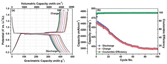 These lower capacity and cyclic stability issues were solved by the implementation of Bi anode in all-solid-state Li-ion batteries [59]. Jain and co-workers did excellent work in this regard. Details of all-solid-state Li-ion batteries (ASSLIBs) are already discussed in the introduction section. They proposed the bulk bismuth as a negative electrode for ASSLIBs. In the electrode preparation, lithium borohydride (LiBH4) and acetylene black (AB) were milled with bulk bismuth powder. The acetylene black provided the electrical conductivity to the anode whereas LiBH4 provided the path to Li ions. The electrochemical performance of the Bi-based electrode was tested between 0.1 and 1.5 V at the current rate of 0.1 C. The discharge capacity decreased from 478.7 to 394 mAhg−1 after 100 cycles with stable coulombic efficiency as shown in Figure 3. This battery cell showed good performance as compared to the reports of Bi-based anodes with liquid electrolytes [54,55]. In this study, no cracks were observed even after 100 cycles. This implied that LiBH4 and AB worked as a binder, which provided the cushioning effect and accommodated the volume expansion efficiently without breaking the electrode, which resulted in an improvement of the cyclic stability.