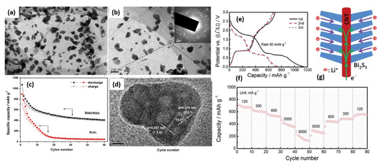 To investigate the electrochemical performance of Bi2S3, many different approaches have been adopted [60,61,62,63,64]. The most common approach is nanostructuring. Zhang and coworkers synthesized dandelion-like microstructures using the facile reflux synthetic route [65]. This work compared the overall electrochemical performance of nanostructured Bi2S3 and Bi2S3-carbon nanotube (CNT) nanocomposites. They observed the first discharge capacity of Bi2S3 and Bi2S3/CNT composites as 826 and 574 mAhg−1. In the first cycle, the discharge capacity of the composite was found less. However, their coulombic efficiency (63.9%) was found more than that of Bi2S3 nanostructures (57.8%). The cyclic capacity of Bi2S3/CNT composite was found to be better than the Bi2S3, i.e., 247.9 and 74.7 mAhg−1 after 50 cycles at 100 mAg−1 rates. This improved cyclic capacity was attributed to the improved conductivity and buffering effect provided by the CNT, which compensated the volume expansion associated with the formation of Li2S and Li3Bi. Further, in their next step, they investigated the performance of Bi2S3 composites with graphene oxide (GO) [64]. The synthesis of properly anchored Bi2S3 nanoparticles in graphene oxide sheets was done via the hydrothermal route. The same method was adopted to synthesize Bi2S3 nanoparticles without the addition of graphene oxide. The transmission electron microscopy (TEM) images of anchored nanoparticles are depicted in Figure 5a,b,d. This helped to better understand the effect of GO on the overall electrochemical performance of Bi2S3. The size of the nanoparticles was estimated to be 80–100 nm. The anchoring in GO provides some advantages like higher conductivity, efficient accommodation of large volume expansion the same as CNTs, and, additionally, a highly conductive network for rapid electron transport in the electrode during the electrochemical reaction. As evidence of these advantages, the first discharge capacity of the composite was found to be 1073 mAhg−1. Further, the cyclic capacity was also found to be comparatively stable, with a capacity of 400.5 mAhg−1 at 100 mAg−1 rates after 50 cycles. This reversible capacity value was higher than the bare Bi2S3 nanoparticles and Bi2S3/CNT nanocomposites. Bare Bi2S3 nanoparticles showed a cyclic capacity of 44.7 mAhg−1, which is less than the dandelion-like Bi2S3 microstructures. The cycling performance of both the samples are shown in Figure 5c. The possible reason for this was suggested as the agglomeration of nanoparticles during cycling. Additionally, after 10 cycles, the coulombic efficiency of Bi2S3/GO was found to be 95%, which was attributed to the buffering effect of reduced graphene oxide (rGO) that efficiently mitigates the volume expansion during lithiation and delithiation.
