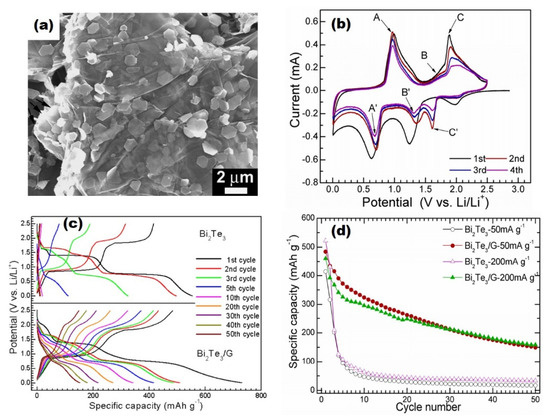 To enhance the cyclic stability of Bi2Te3, Masood et al. prepared Bi2Te3 and graphene oxide (GO) composites [31]. The adopted method for synthesis was the polyol method, which signified the distribution of Bi2Te3 into the GO matrix. The prepared composite showed the first discharge and charge capacity as 752 and 514 mAhg−1, respectively, at the current density of 0.1 Ag−1. These values were higher than the theoretical capacity of Bi2Te3 itself, due to the formation of the SEI layer. By incorporating Bi2Te3 into the GO matrix, the electrical conductivity due to fast Li-ion diffusion was observed to be enhanced. Further, this matrix helped to accommodate the volume changes. The excellent cyclability was found to be 110 mAhg−1 in the 500th cycle at the current rate of 0.1 Ag−1. These were promising results, which indicated that the GO matrix may help to enhance the cyclability. However, the higher value of the specific capacity was still lacking. Tu et al. prepared Bi2Te3 nanoplates and graphene nanocomposites to provide a higher electrical conductivity to graphite to enhance the electrochemical performance [78]. Graphene is a monolayer of sp2-bonded carbon atoms that possess higher electronic conductivity, excellent mechanical properties, and a higher specific area [79,80,81,82]. These properties make graphene a preferable conducting medium for Li-ion batteries. Bi2Te3 nanoplates were prepared by the solvothermal method and then composites with Bi2Te3 nanoplates were prepared for the investigation of electrochemical performance. The SEM of Bi2Te3 nanoplate/graphene is shown in Figure 7a. The understanding of cyclic voltammetry (CV) is imperative to discuss first. As depicted in Figure 7b, the CV of Bi2Te3/graphene nanocomposites at 50 mAg−1 up to 4 cycles suggested a multi-step reaction of Li with Bi2Te3. In the first cathodic scan, three different reduction peaks were observed at 2, 1.25, and 0.6 V. These peaks were attributed to lithium insertion, and the formation of Li2Te and formation of Li3Bi, respectively. The reaction mechanism could be understood by the schematic diagram shown in Figure 4. In the second scan, peaks were observed at 1.65, 1.35, and 0.7 V. The peaks at 1.65 and 1.35 V indicated that the reaction of Te and Li occurred via a two-step reaction with the formation of LiTe3 and Li2Te. These phases have been reported as stable phases at room temperature [83]. The first discharge capacity of the composite was found to be higher, which was attributed to the formation of a solid electrolyte interface (SEI) layer. The specific capacity of the bare Bi2Te3 rapidly decayed whereas Bi2Te3/graphene nanocomposites showed a relatively better performance as shown in Figure 7c. The reason for the stability was proposed based on the restricted crystal growth of Bi2Te3 due to graphene, resulting in easy diffusion in the Bi2Te3 matrix. Additionally, separated layers of graphene sheets provided extra vacancies for the Li ion due to the contact sites between the electrolyte. The cyclic performance of the Bi2Te3/graphene composites was also found to be better than bare Bi2Te3 as depicted in Figure 7d. After 50 cycles, the charge capacity was obtained as 158 and 33 mAhg−1 in case of Bi2Te3/graphene and bare Bi2Te3, respectively. The enhanced cyclic capacity was due to the buffering effect of conducting graphene that restrains the aggregation of Bi2Te3 plates and restricts the volume expansion. Further, this structure also offered the Li-ion diffusion within the free space through the electrode and electrolyte interface. This work was quite important in the direction of the application of Bi2Te3 and their composites for Li-ion batteries.