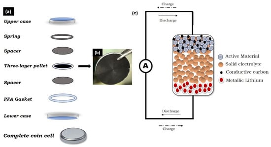 (a) Schematic diagram of the cell assembly; (b) picture of the actual prepared pellet and (c) schematic illustration of the working of the all-solid-state lithium ion battery.