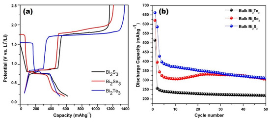 (a) First galvanostatic charge-discharge capacity of bulk Bi2X3 in the voltage range 0.2–2.5 V at the 0.1 C rate; (b) Cyclic capacity of Bi2X3 up to 50 cycles.