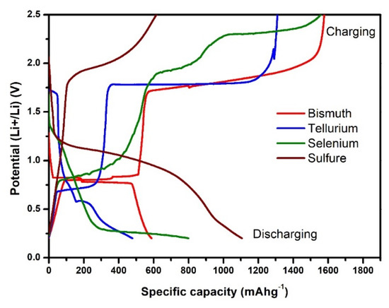 Galvanostatic charging-discharging curve for the first cycle of Bi, S, Se, and Te in the potential window of 0.1–2.5 V.