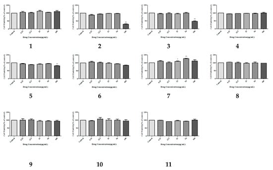 The effect of the isolated compounds on the survival rate of HepG-2 human hepatocellular carcinoma cells. The cells were pretreated with concentrations (6.25, 12.5, 25, 50, and 100 µg/mL) of compounds 1–11 for 1 h. The data show the mean ± SD of three independent experiments performed in triplicates.