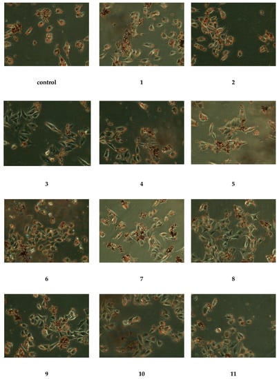 To evaluate the inhibitory effects of the isolates on oleic acid-induced lipid accumulation, HepG-2 cells were treated with compounds 1–11 (50 µg/mL) in the presence of oleic acid for 24 h. The results were displayed in Figure 4, and HepG-2 cells in the control group contained numerous red lipid droplets fused each other, indicating that the HepG-2 cell lipid accumulation model was set up successfully. The lipid drops in cells treated with compounds 1, 3–11 had light colors and smaller volumes, while compound 8 was the most obvious by comparison with the control group. Through the above phenomena, we could conclude that compounds 1, 3–11 had strong antilipidemic activity, while compound 8 had the strongest antilipidemic activity.