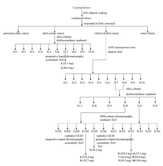 We dried the plants at 60 °C in the oven; next, the processed herbs of G. pentaphyllum (about 5000 g) were soaked in 60% C2H5OH/H2O solution (v/v) for three days, three times in total, and then filtered. The extracted solution was mixed and rotated to evaporate until no alcohol was present. We suspended the extract with water, and then extracted it with three different polar solvents (petroleum ether (PE) three times, ethyl acetate (EtOAc) five times, and five times with n-butanol). After this step, the EtOAc extract was analyzed using silica gel column chromatography (v/v, MeOH: CH2Cl2, 0–75%, gradient elution), giving 10 fractions (Fr.1–Fr.10). Fr.7 was chromatographed using Sephadex LH-20 and RP-HPLC (v/v, acetonitrile: H2O, 0–100%, stepwise) to yield 21.1 mg of 1, along with 20.6 mg of 2. Then, the n-butyl alcohol extract was chromatographed over D-101 macroporous resin (v/v, ethanol: H2O) to get the 70% ethanol eluate; after drying, 43.46 g of saponins were obtained. The saponin part was isolated using silica gel CC (v/v, MeOH: CH2Cl2, 0–80%, gradient elution) to give 10 fractions (Fr.1–Fr.10). After combining Fr.7 with Fr.8, they were separated into six fractions (Fr.A–Fr.F) through chromatography over silica gel (v/v, CH3OH: CH2Cl2, 0–100%, gradient concentration elution). Fr.D and Fr.E were subjected to RP 18 CC (v/v, CH3OH: H2O, 0–100%, stepwise) to yield six fractions named Fr.D1–Fr.D6 and Fr.E1–Fr.E6, respectively. Fr.D4 was isolated using RP-HPLC (v/v, acetonitrile: H2O) and Sephadex LH-20 gel to yield 274.4 mg of 4 and 32.4 mg of 11. Compound 3 (40.2 mg) was obtained via RP-HPLC (v/v, acetonitrile: H2O), Sephadex LH-20 gel, and thin layer chromatography (TLC) of Fr.D5. Fr.F4 isolated through CC over Sephadex LH-20 gel, RP-HPLC (v/v, acetonitrile: H2O), and TLC to yield 109.2 mg of 5, 17.1 mg of 6, 20.0 mg of 7, 64.0 mg of 8, 36.5 mg of 9, and 38.0 mg of 10 (see Figure 5).