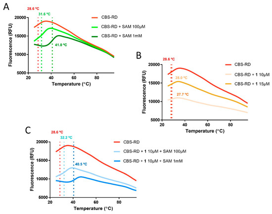 Differential scanning fluorimetry was implemented to identify a possible binding interaction of the inhibitor 1 with the regulatory domain of CBS (CBS-RD). A series of representative melting curves as those shown above, suggest that 1 does not bind CBS-RD. (A) Addition of the cofactor s-adenosylmethionine (SAM) (100 μM, light green, Tm: 31.6 °C; 1 mM, dark green, Tm: 41.0 °C) results in a dose-response stabilization effect on CBS-RD as compared to the apoprotein (red, Tm: 28.6 °C). (B) In contrast, no stabilization is monitored by increasing concentrations of 1 (10 μM, light brown, Tm: 28.0 °C; 15 μM, dark brown, Tm: 27.7 °C). (C) Co-administration of SAM and 1 (100 μM SAM, 10 μM 1, light blue, Tm: 32.2 °C; 1 mM SAM, 10 μM 1, dark blue, Tm: 40.5 °C) results in a stabilization and response that are practically identical to the case where only SAM is bound to CBS-RD, showing that no binding or any kind of cooperativity takes place between 1 and the SAM-protein complex.