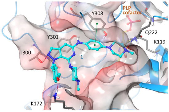 The dominant binding geometry of 1 inside the CBS active site as determined by the induced-fit algorithm for docking calculations. The inhibitor is anchored to the enzyme by a number of hydrogen bonds depicted as red dashed lines, whereas a strong stacking interaction between the phenylamino ring of 1 and Tyr308 (shown as green dashed line) further stabilizes the complex. The two piperazine rings of the inhibitor are deprotonated, whereas piperazine of R2 is positioned in close proximity to the catalytic Lys119, covalently attached in this structure to the cofactor pyridoxal aldehyde as a Schiff base. The protein is depicted as a blue ribbon and molecular surface colored according to the electrostatic potential (red: negative; blue: positive). The ligand and protein interaction geometry demonstrates high complementarity and an excellent occupancy of the pocket by the inhibitor.