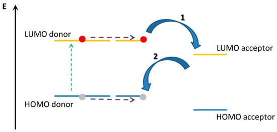 In this section, supramolecularly assembled dyads formed by phthalocyanines acting as electron donor compounds will be considered and examined. In fact, the relevant light harvesting of Pcs derivatives, even higher than that one of porphyrin derivatives, ensures an efficient electron excitation under visible illumination and, if coupled with suitable molecules, efficient electron donor features. Charge transfer mechanism in conjugated compounds is strongly limited by the binding energy of the lowest singlet excitation (about 0.4 eV) [63,64]. In this class of organic compound, the photo-generated exciton is a thermodynamically stable specie, so the charge separation (CS) step appears forbidden or not-favored. On the contrary, the charge transfer (CT) process can be obtained using electron donor and electron acceptor species in both multi-layered and blended geometries. In this approach, photons are absorbed by the donor and/or acceptor species. In the case that most of irradiating photons are absorbed by the electron donor species, an electron-hole couple is formed on this compound as a consequence of the promotion of π-electrons from the HOMO to the LUMO level (Figure 3). In order to separate the hole-electron pair, the exciton has to move up to reach the interface with the acceptor element [65].