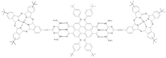 Nevertheless, the appropriate energetic levels of Pcs and PDI prompted Guldi’s and Torres’ research teams to propose several photo-active system based on the Pcs-PDI dyad. The electronic communication between Pcs and PDI was already used to carry out TiO2-based dye sensitized solar devices and Forster resonant energy transfer from PDI to Pcs was used to enhance the spectral range of photon absorption up to blue region of the visible spectrum [67,68]. Starting from these evidences, a supramolecular three-dimensional Pcs (in the role of electron donor)–PDI (as electron acceptor) photo-active layer was built up [69]. In particular, a Pc functionalized with a ditopic melanine moiety supramolecularly binds a bifunctional PDI by means of hydrogen bonds (Figure 4). As highlighted by UV-Vis and fluorescence measurements, a complex formed by two Pcs and one PDI derivative linked by hydrogen bonds is obtained.