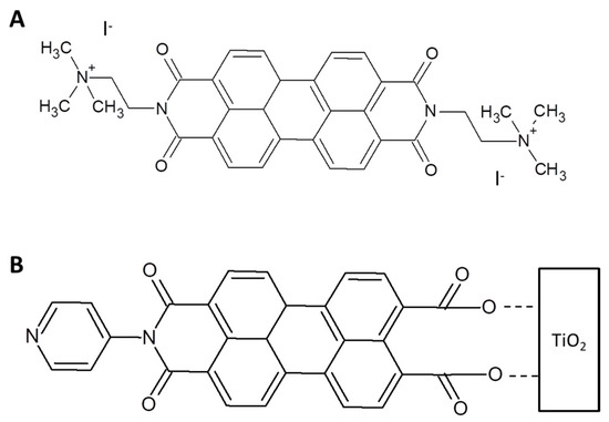 (A) Double charged PDI derivative used to form the photoactive dyad with ZnPc. (B) Asymmetrically substituted perylene imide linked to TiO2 to build up a dye sensitized solar cell [76].