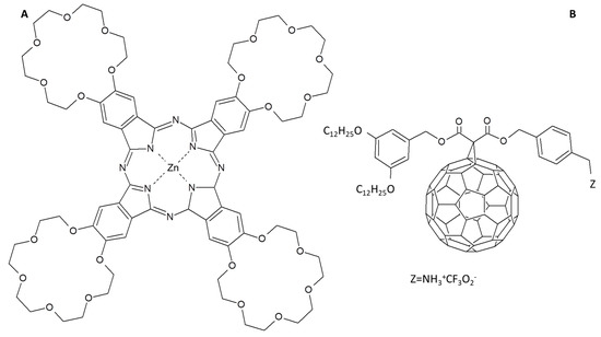 (A) 18-crown tetra functionalized ZnPc and (B) C60 derivative chemical structures [85].