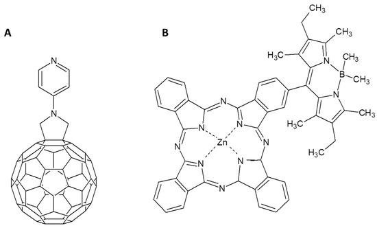 (A) Pyridine functionalized fulleropyrrolidine and (B) BODIPY-substituted ZnPc proposed in [92].