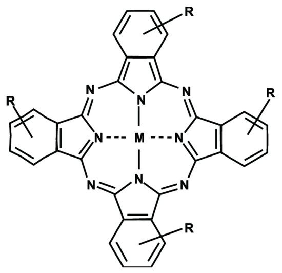 General structure of the phthalocyanine macroring, where M is the central metal ion or H2 in the case of the free base. R is the potential functionalization on the phthalocyanine periphery.