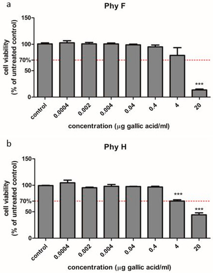 Figure 1. Cell viability of HUVECs cells treated with Physalis herba and fruit extracts in different concentrations compared to untreated cells. To evaluate the viability, HUVECs cells were exposed to PhyF (a) and PhyH (b) extracts in concentrations ranging from 0.0004 to 20 µg GAE/mL. The viability was tested through the colorimetric measurement of formazan using CellTiter 96® AQueous Non-Radioactive Cell Proliferation Assay. Data are presented as percent of untreated controls (mean ± SD, n = 3 for each sample). *** p < 0.001.