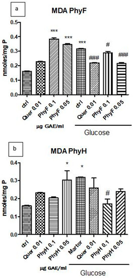 Figure 2. Malondialdehyde levels in HUVECs lysates exposed to hyperglycemia and normoglycemia and treated with Physalis extracts and quercetin. (a) The MDA levels (nmoles/mg protein) after exposure to hyperglycemia and pretreatment for 24 h with Physalis fruits extract (0.05 and 0.1 μg GAE/mL) and quercetin. (b) MDA levels (nmoles/mg protein) after exposure to hyperglycemia and PhyH extract and quercetin. The statistical significance of the difference between treated and control groups was evaluated with one-way ANOVA, followed by Tukey’s Multiple test. * p < 0.05; *** p < 0.001, treated vs. untreated cells in normoglycemia; and control in hyperglycemia vs. control in normoglycemia; # p < 0.05, ### p < 0.001, treated groups in hyperglycemia vs. control group in hyperglycemia.