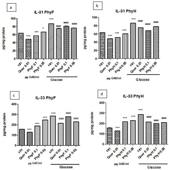 Figure 3. IL-31 and IL-33 levels in HUVECs cells exposed to normo- and hyperglycemia and treated with Physalis extracts and quercetin. Inflammatory markers in cell lysates of HUVECs cells exposed to Physalis extracts (0.05 and 0.1 μg GAE/mL PhyF and PhyH) and quercetin. Protein levels of IL-31 (a,c) and IL-33 (b,d) were determined by ELISA (pg/mg protein). Each bar represents a mean ± standard deviation (n = 3). The statistical significance of the difference between treated and control groups was evaluated with one-way ANOVA, followed by Tukey’s Multiple test, * p > 0.05; *** p < 0.001, treated vs. untreated cells in normoglycemia and control in hyperglycemia vs. control in normoglycemia; ### p < 0.001, treated groups in hyperglycemia vs. control group in hyperglycemia.
