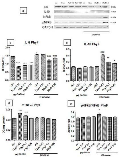 Figure 4. TNF-α, IL-6 and IL-10 levels and pNFkB/pNFkB ratio in HUVECs cells exposed to normo- and hyperglycemia and treated with Physalis fruits extract and quercetin. Representative images of immunoblotting for IL-6, IL-10, NFkB, pNFkB and GAPDH in cell lysates of HUVECs exposed to 0.05 and 0.1 μg GAE/mL Physalis fruits extract (PhyF) and quercetin are shown in the upper panel (a) and the results of statistical analysis for the ratio of IL-6, IL-10 and GAPDH expression in the lower panels (b,c). Image analysis of two bands, NFkB and pNFkB, were completed by densitometry (e) and the results are expressed as pNFkB divided by the total NFkB. (d) TNF-α levels were determined by ELISA (OD/mg protein). Each bar represents mean ± standard deviation (n = 3). The statistical significance of the difference between treated and control groups was evaluated with one-way ANOVA, followed by Tukey’s Multiple test. * p < 0.05; *** p < 0.001, treated vs. untreated cells in normoglycemia and control in hyperglycemia vs control in normoglycemia respectively; # p < 0.05, ## p < 0.01; ### p < 0.001, treated groups in hyperglycemia vs. the control group in hyperglycemia.
