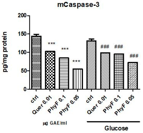In normoglycemia, the administration of quercetin and two doses of extract diminished the caspase-3 active form (p < 0.001) (Figure 5). The same effect had the treatment with a low and high dose of PhyF, demonstrating the antiapoptotic effect of the PhyF extract. Quercetin reduced the caspase-3 active in medium compared to the control, untreated cells (p < 0.001).