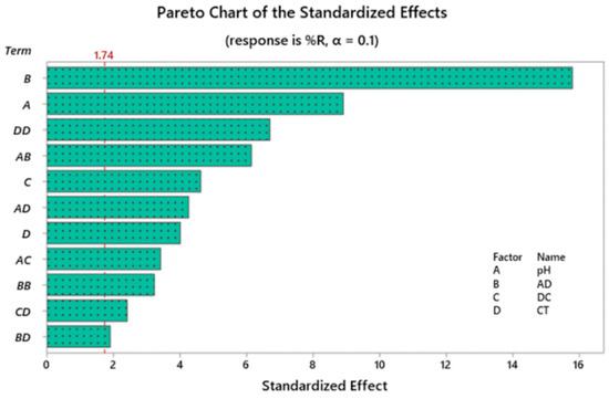 It is noteworthy to mention that response surface regression was performed versus blocks, pH, AD, DC as well as the CT employing Box-Cox transformation [37] where the transformation factor, λ = 0.75 and backward elimination of terms (α to remove = 0.1) was used, Equation (3):