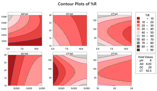 Figure 2 illustrates the two–dimensional (2D) plots for the measured fitted response surface. Each of the shown panels reveals the effect of two factors on %R. As shown in the attached legend, the dark red color implies a lower %R, while dark grey color means higher %R. Having the upper left panel as an example (AD × pH), having an AD of 0.042–0.048 g/50 mL and a pH level of 5.00–5.20, the %R is in the range of 50%–60%. Similar conclusions can be obtained from the rest of panels for each factorial combination.