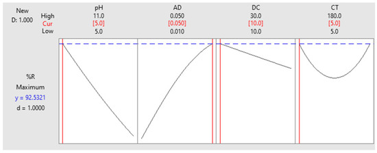 Optimization plot. A factorial combination of pH = 5.00 ± 0.20, AD = 0.050 g/50 mL, DC = 10 ppm and CT of 5 min. would achieve %R = 92.53%.