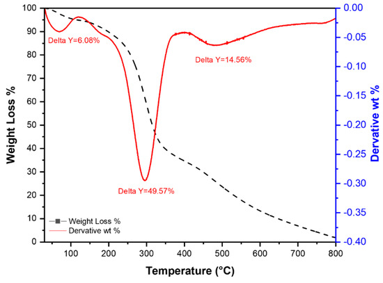 - In this step, >49% of the sample is decomposed between (200–500 °C) including the loss of crystalline water at ~200 °C and part of the organic matter, as represented by a major peak at 305 °C, which could be ascribed to the decomposition of the organic material in RPAL,