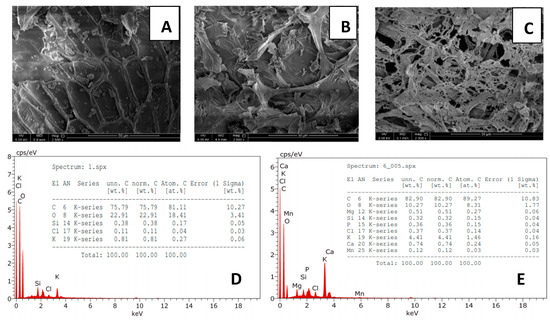The surface structure of the raw and the thermally treated PAL was explored using the scanning electron microscope (SEM). The SEM micrographs presented in Figure 7 showed that the RPAL (Figure 7A) has plain surface without any pores and the same was also observed following the burning process at 250 °C (Figure 7B). On the other hand, the surface has completely changed after burning at 500 °C. Figure 7C shows the presence of high porous surface compared to the raw material, confirming the formation of carbonaceous material with advanced pore structure and the loss of organic matter after burning at 500 °C. These findings are in a good match with the obtained data by FT-IR and TGA analyses. Furthermore, EDX analysis shows the effect of the burning process on the concentration of carbon and oxygen. Results show that carbon content has increased from 75.79% in the RPAL to 82.90% in the burnt sample (Figure 7D,E). In addition, the oxygen content has decreased from 22.91% in the RPAL to 10.27% in RPAL500. This decrease might be attributed to the loss of water oxygen during the burning process, an issue that might have a negative impact on the removal efficiency of the thermally treated samples and as was confirmed by the FT-IR and Raman analyses.