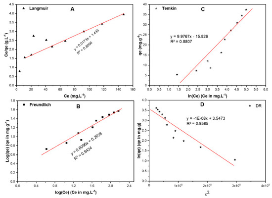 Adsorption isotherms of RB on RPAL including (A) Langmuir, (B) Freundlich, (C) Temkin, and (D) Dubinin–Radushkevich (DR).