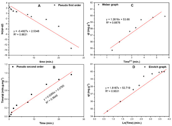 Kinetic models for the adsorption of RB on RPAL including (A). Pseudo first order, (B). Pseudo second order, (C). Elovich and (D). intra–particle diffusion (Weber–Morris) curves.
