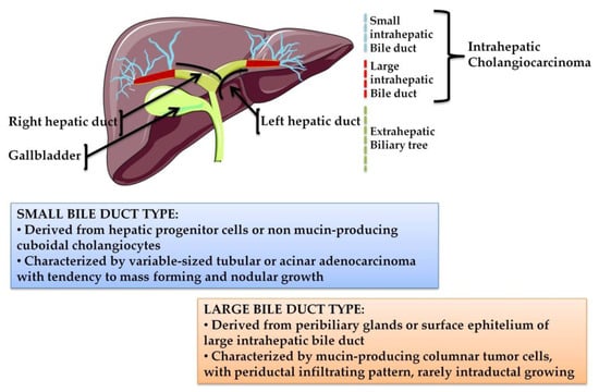The biliary tree, based on anatomical classification, is subdivided into intrahepatic and extrahepatic portions. The extrahepatic tract comprises the right and left hepatic ducts, from which arises a perihilar CCA (pCCA), the common bile duct that accounts for distal CCA (dCCA), and the gallbladder. The intrahepatic counterpart derives from the second-order bile ducts. The sub-classification of intrahepatic CCA (iCCA) is based on the size of the duct from which the tumor originates: The small bile duct type arises from the interlobular and septal ducts, while the large duct type arises from the segmental ducts.
