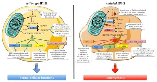IDH1 is a multifaceted enzyme with a crucial role in cellular metabolism, epigenetic regulation, cellular redox homeostasis, and DNA repair. Specific hot-spot mutations influence its catalytic activity, promoting a gain-of-function of the mutant form with aberrant and uncontrollable consequences on normal cell activities. Branching out into different physiological functions in the cells, IDH1 mutations play a role in carcinogenesis processes, gaining value as novel targets for anticancer therapies (Figure 2).