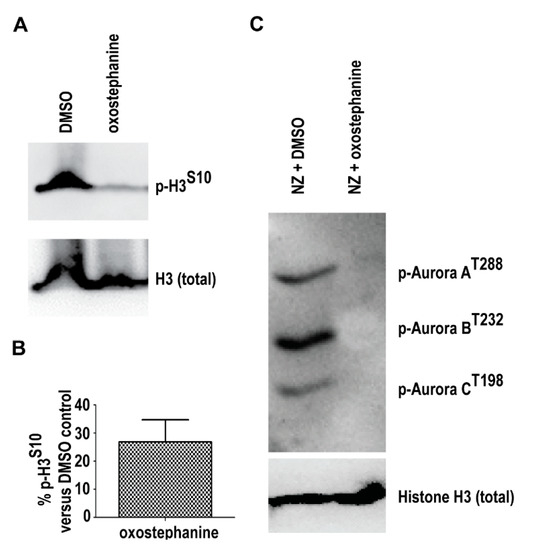 Inactivation of Aurora kinases A and B by specific inhibitors leads to the induction of spindle assembly checkpoint (SAC), arresting cells at mitosis. However, the SAC checkpoint is not permanent, as it is soon overridden and cells exit mitosis without proper chromosome segregation [42]. The inhibition of Aurora A or Aurora B may eventually induce apoptosis or DNA reduplication without undergoing cytokinesis [42]. Data shown in Figure 3 are reminiscent of the previous observations in human cells with ablated Aurora kinases. Therefore, we examined whether Aurora kinases are the targets of oxostephanine (1) using Western blot analysis. As shown in Figure 4A,B, HeLa cells treated with oxostephanine (1) for 12 h dramatically downregulated the phosphorylation of histone H3 on Ser-10, a known molecular target of Aurora kinases [43]. The effect of oxostephanine on autophosphorylation of all three Aurora kinases in HeLa cells arrested in mitosis was also investigated (Figure 4C). Data from our Western blot also showed that upon treatment of cells, Aurora A, B, and C phosphorylation was reduced, showing that oxostephanine (1) inhibits the auto-phosphorylation of all three Aurora kinases (Figure 4C). These data indicate that Aurora kinases are indeed a target of oxostephanine.