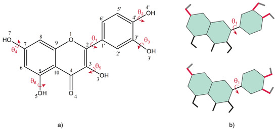 (a) The chemical structure of Quercetin, which emphasizes the flexible torsion angles considered for structure determination, including DFT geometry optimization; (b) the two distinct relative conformations of the catechol and benzopyran rings found in all the reported solid forms of Quercetin, close to syn—bottom, and close to anti—up.