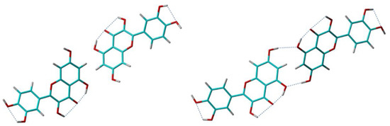 Intermolecular contacts of Quercetin molecules along the benzopyran rings depending on the conformation of the –O7-H hydroxyl in two crystal structure models of anhydrous Quercetin, Quer-1 (left), and Quer-2 (right).