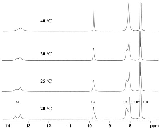 For compounds 1c and 2a, the 1H-NMR signals of the N-H proton were sufficiently intensive to perform temperature-dependent measurements up to 40 °C (Figure 2 for 2a and Figure S17 for 1c). Thereby, the ratio of the existing tautomers at temperature of 25 °C was estimated to be around 40/60, measured by the intensities of the signals of N-H protons for both tautomeric forms and processed with deconvolution analysis. However, the 1H-NMR spectra were not sufficient to assign each of the signals to one particular tautomer. The variable temperature experiments showed that the rate of the tautomerism depends also on the concentration of the solution—the less concentrated the solutions, the better the resolution of the 1H spectra at lower temperature (Figure S47). This could be associated with the different types of intermolecular interactions that govern the tautomerism in the studied 2-phenyl imidazoles, which make the tautomerization process multifactorial. Due to the very limited solubility of the compounds, DMSO was the only suitable choice for solvent. Although other solvents may allow recording spectra at lower temperatures, the change of the solvent will add another factor that may alter the tautomerization process, making the data case-specific and with less practical importance.