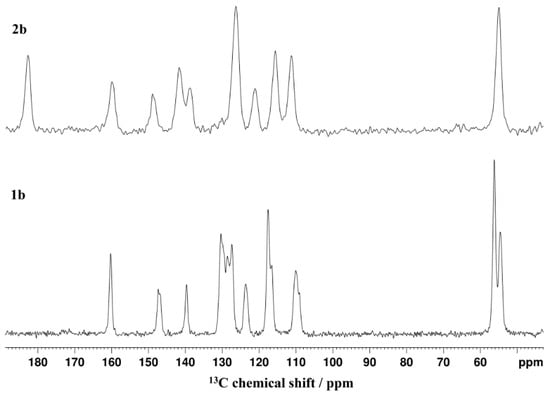 To avoid the described incompleteness of the 13C-NMR in solution, we performed 13C CP-MAS NMR measurements in the solid state. For all studied compounds, the 13C CP-MAS NMR spectra clearly indicated strong signals for each of the carbon atoms, as shown in the Supplementary Materials. At first glance, the solid materials do not show evidence for presence of two different tautomeric forms, except for sample 1b. The 13C CP-MAS spectrum of 1b is shown in Figure 3 in comparison with the spectrum of the corresponding aldehyde 2b. In the case of compound 1b, where the CP-MAS signals are particularly sharp, a distinct splitting of the signals at 147 ppm and 110 ppm is observed. We are aware that the crystallization of molecules can lead to splitting of NMR signals by distinguishing magnetically inequivalent but chemically equivalent sites if there is more than one molecule in the crystallographic unit cell or if the molecular symmetry is broken by the symmetry of the crystallographic lattice. However, both reasons can be excluded in our systems on the basis of the additional NMR experiments that we performed in the solid state. Cross-polarization/polarization-inversion (CPPI) measurements for compound 1b allowed for clear distinction of the quaternary C-atoms in the solid state and facilitated the signal assignments (Figures S6, S14 and S26 for 1a, 1b, and 2a, respectively). The CPPI spectrum of 1b allowed us to distinguish the methoxy and alkoxy carbons that exhibit chemical shifts of 55.8 and 54.2 ppm, respectively. Most importantly, the CPPI measurement showed that an additional signal of a quaternary C-atom with a chemical shift of 130.0 ppm is hidden under the signals of the CH carbons of the phenyl ring (Figure S14). Thus, five quaternary carbon atoms were detected in the aromatic region instead of the expected four quaternary carbons for 1b (two from the benzene and two from the imidazole ring). The chemical shifts of the quaternary carbons approximate to the values of the calculated chemical shifts for both tautomeric forms, as shown in Table 2. This was the first suggestion that in sample 1b both tautomers are present in the solid state, which motivated our more detailed solid state NMR studies on all other compounds as well.