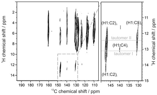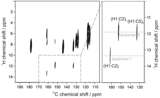 An additional proof for the co-existence of both tautomeric forms in the solid state is provided by the 1H-13C CP-MAS correlation spectrum (HETCOR) of compound 1b (Figure 4), where two distinct correlation patterns for both NH sites are seen. These are indicated in the magnified part of the correlation spectrum (right block in Figure 4) as correlations from tautomer I (at 13.1 ppm for NH) and tautomer II (at 12.4 ppm for NH). The former NH site is adjacent to only one quaternary carbon atom, which is C2 in tautomer I (Figure 1), whereas the NH site in tautomer II is adjacent to two quaternary carbon atoms (C2 and C5). These three correlation signals are well seen in the spectrum of 1b, although the signals for the H1-C2 correlations from tautomer I—(H1:C2)I and from tautomer II—(H1:C2)II slightly overlap due to proximity of their 13C-chemical shifts. We like to point out that CP-MAS correlation signals are through space correlations via hetero-nuclear dipolar couplings and that correlations to protonated 13C sites are in most cases truncated by dominating hetero-nuclear dipolar couplings of the covalently bound hydrogen. The (H1:C4)I correlation signal from tautomer I is very weak because the atoms are not adjacent, but becomes detectable when the intensity of the signals is enhanced, as is the case depicted in Figure 4.