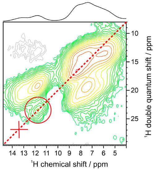 For selected cases (2b, 2c, and 2d), 1H double quantum coherence experiments have been performed in an attempt to identify the arrangement of the molecules in the crystal lattice. In the case of 2d (Figure 6, and for 2c Figures S43 and S44), the correlation peak at 11.9 ppm in the chemical shift dimension and 23.8 ppm in the double quantum dimension (red circle) indicates spatial proximity between the N-H protons of the molecules of tautomer II within less than 4 Å. The corresponding correlation signal for form I, which should be observed at 13.4 ppm in the chemical shift dimension and 26.8 ppm in the double quantum dimension (red cross), is not detected. This demonstrates that the two tautomeric forms of 2d crystallize in different crystalline domains that stabilize the different tautomeric forms and allow for tautomeric exchange only within the domain. Similar are the observations for the benzonitrile derivative 2c. It is worth noting that from our numerous attempts to obtain good quality single crystals from all studied compounds, for compound 2c we obtain visibly different crystalline phases that slightly differ in color, however, no single crystals (microscope image Figure S56).