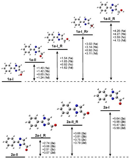 The geometry optimizations of both tautomers (forms I and II in Figure 1) and some of their possible rotamers (in total 5 types for the alcohols and 4 types for the aldehydes) were performed in gas phase and in DMSO solvent. The B3LYP functional and the 6-31G(d,p) basis set were used for all types of calculations. For selected compounds, other functionals and broader basis set have been employed but no change in the tendencies was observed. Therefore, we limited the theoretical description to the method B3LYP/6-31G(d,p) which, according to our experience, provides reliable results also for the nuclear shielding by the gauge-independent atomic orbital (GIAO) calculations [24,25,26,34]. The calculated energy differences for all optimized geometries are depicted in Figure 7.