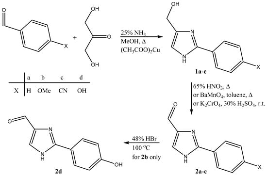 The synthesis was achieved by following and, depending on the type of the substituent, significantly improving the existing protocols. For the synthesis of the imidazole ring, we applied the Weidenhagen reaction [31], according to the experimental procedure described by Baldwin et al. [32] and introducing some modifications at the work-up stage. The aldehydes 2a–c were obtained from the corresponding alcohols (1a–c) by mild oxidation with BaMnO4 that has been freshly synthesized following a published procedure [33]. The aldehyde 2d was obtained from 2b by heating for 15 h at 100 °C in 48% HBr, and therefore the corresponding methanol derivative 1d was not studied experimentally. All compounds were characterized by IR spectroscopy, 1H-NMR, and 13C-NMR measurements in DMSO-d6 solution and in the solid state.