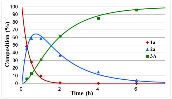 Concentration profile for the components during the hydrolysis of dimethyl α-hydroxybenzylphosphonate (1a) under optimum conditions. The R2 measure of goodness of fit is 0.994.