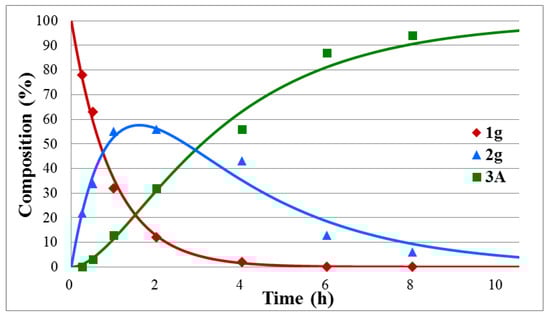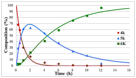 The relative quantity of the components is their molarity divided by the sum of the three molarities (which is c0). The calculated time–composition curves are described by the following equations, by leaving the k1 and k2 rate constants as parameters: