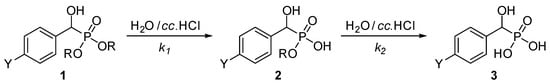 Two-step acidic hydrolysis of substituted α-hydroxybenzylphosphonates. For the Y substituents see Table 1.