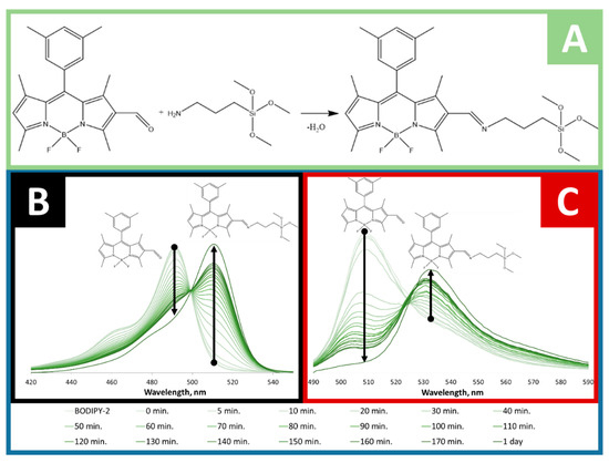 To find out whether BODIPY-2 was covalently conjugated with APTMS, the small portion absorption and fluorescence spectra were measured during the conjugation process (1 day). The same method of evaluation of the covalent bonding of BODIPY was reported in [39]. The absorption and fluorescence spectra were measured in ethanol solution at room temperature and depicted in Figure 2. BODIPY-2 has an absorption maximum at 492 nm and emission peak at 510 nm. During the conjugation process, the absorption and fluorescence peaks red shifts on 20 nm and 24 nm, respectively (Figure 2B,C). That fact can be attributed to the extension of π-electronic system of BODIPY caused by the formation of azomethine bond (Figure 2A and Figure 3). The obtained sol-gel precursor (APTMS@BODIPY-2) was further used in sol-gel synthesis for the preparation of BODIPY-coated silica-based materials.